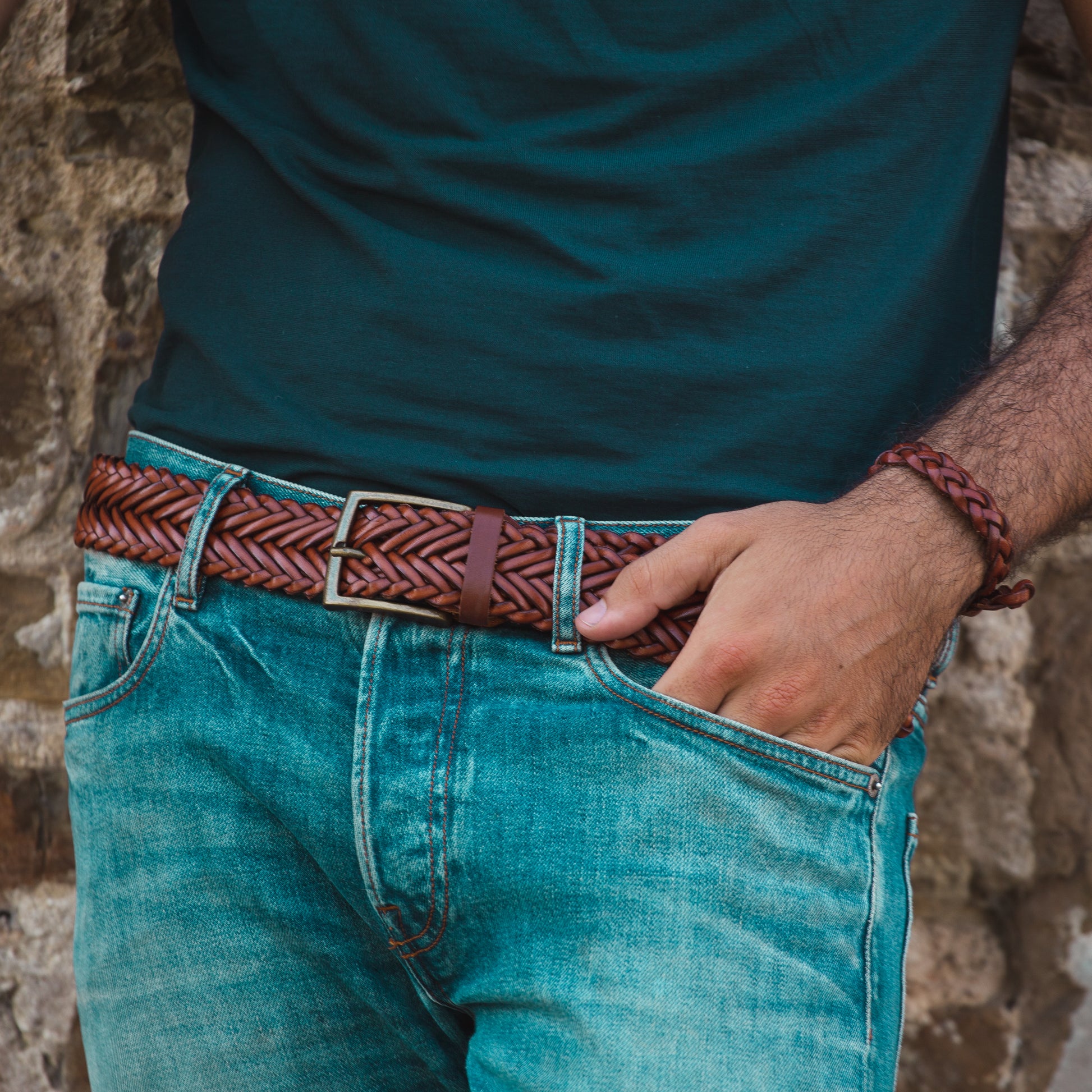 Cintura Spiga in Cuoio Intrecciato a Mano con Fibbia Artigianale in Zama Nickel Satinato e Ottone Antico